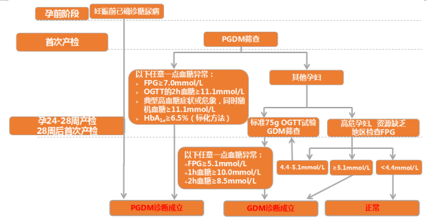 ①妊娠期高危人群第1次产检:即查血糖,如达到非孕人群糖尿病诊断标准,可诊断ODM.