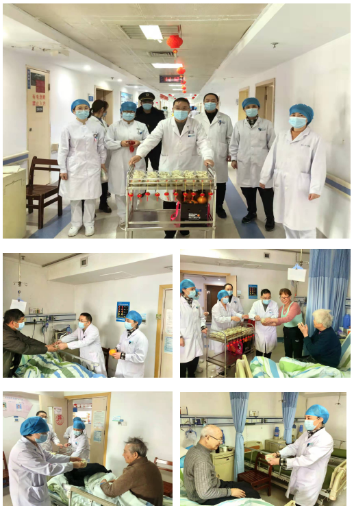 过年本是阖家团圆的时候,但是有部分患者因为疾病需要治疗而无法回家与家人团圆,为了让住院患者在春节期间能够感受到如家般的温暖,2022年1月30日上午,呼吸内科主任王新卫、副主任刘新年和张海英,护士长鲁芹梅和副护士长以及科室医护人员一起给科内住院的每一位患者带来了热腾腾的饺子、红澄澄的橘子和沉甸甸的新年福卡,向他们送去新春的祝福和问候。呼吸内科医生团队详细询问患者的病情和需求,并叮嘱他们积极配合治疗,安心养病。