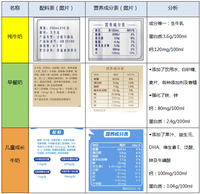 下面就列举一下我们日常熟知的纯牛奶、早餐奶及儿童成长牛奶,教会大家如何具体选择。