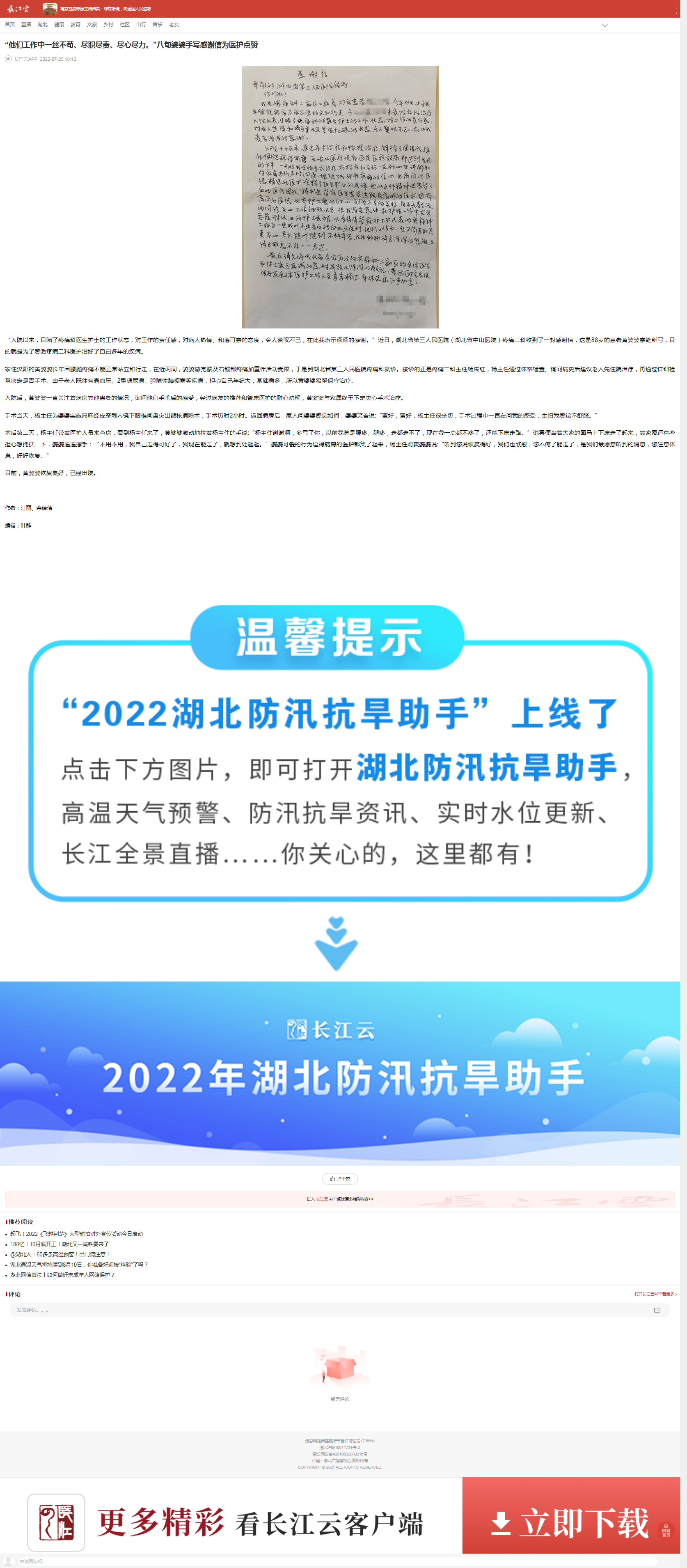 【长江云】“他们工作中一丝不苟、尽职尽责、尽心尽力。”八旬婆婆手写感谢信为医护点赞 发布时间:2022-07-26 来源:长江云 上一篇:【新浪健康湖北】一“镜”到底,为困难插管解难题 下一篇:【楚天都市报】“极速战车”为脑卒中老汉抢到生机