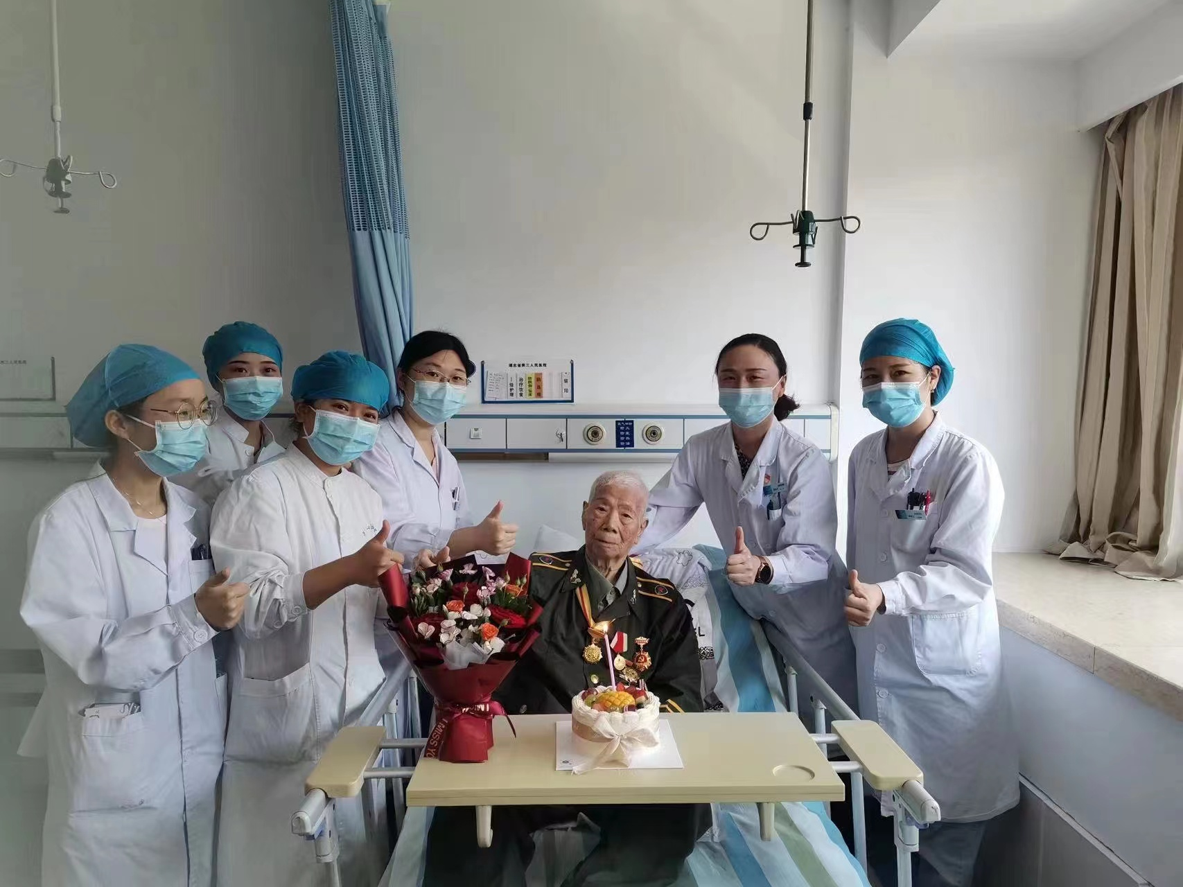 在重阳节来临之际,9月29日,湖北省第三人民医院(湖北省中山医院)全科医学科(老年病科)科主任戴丽星、护士长邹蜜、管床医生罗玮及科内其他医护一起为92岁的老军人、老党员盛老送来节日的祝福。