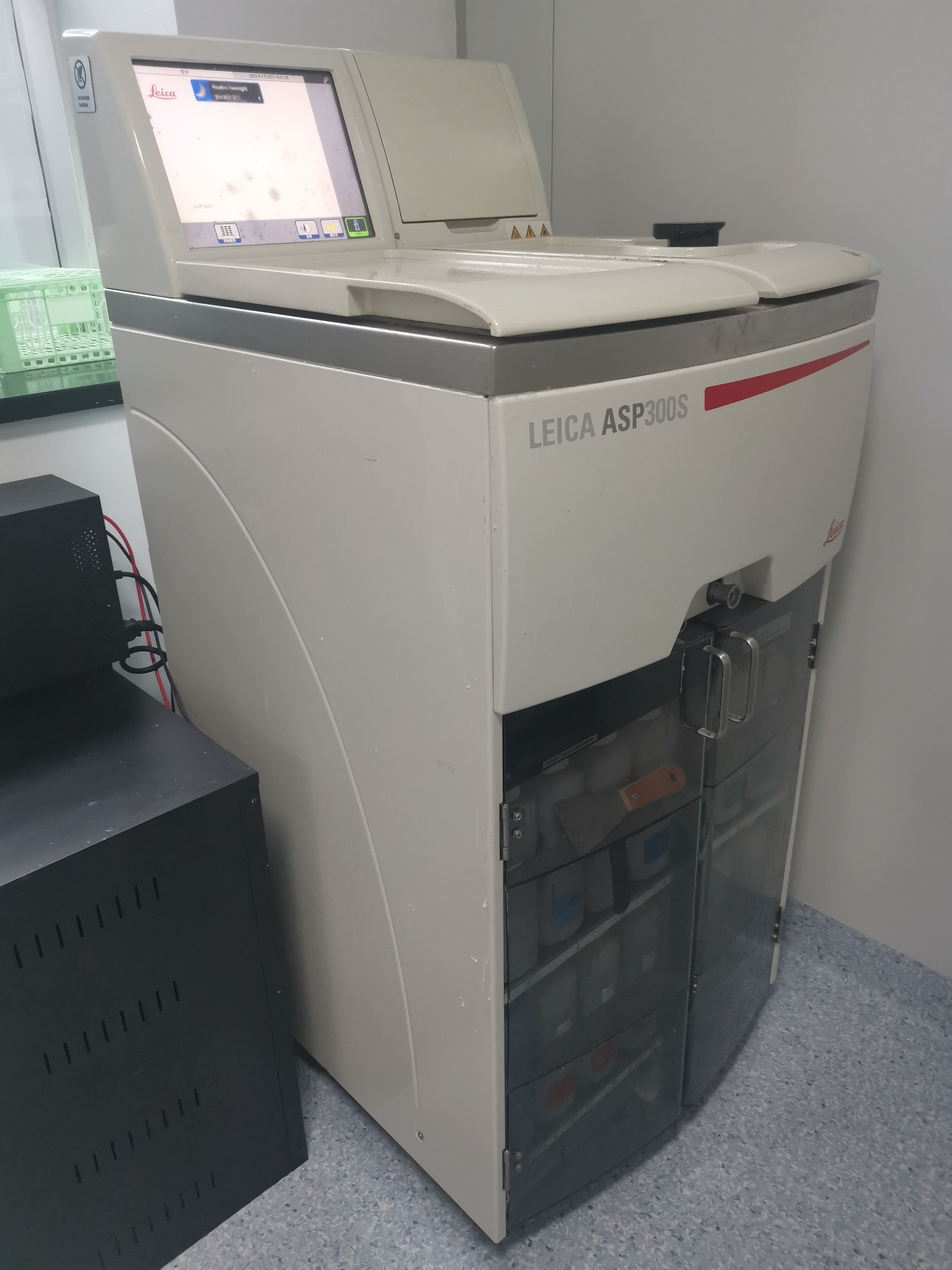 装有标本的包埋盒还要按号排队进入脱水机,这些标本要在脱水机里至少呆上12个小时,经过梯度酒精脱水、二甲苯透明、浸蜡等工序,为后续的工作作准备。