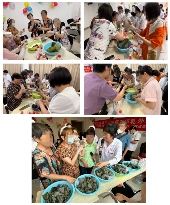 端午节即将来临,医护人员准备了粽叶、蜜枣、糯米等食材,带领病友们齐上阵,大展身手完成一个个外形精致的粽子,整个病区充满了医患和谐的欢声笑语和浓烈的节日氛围。