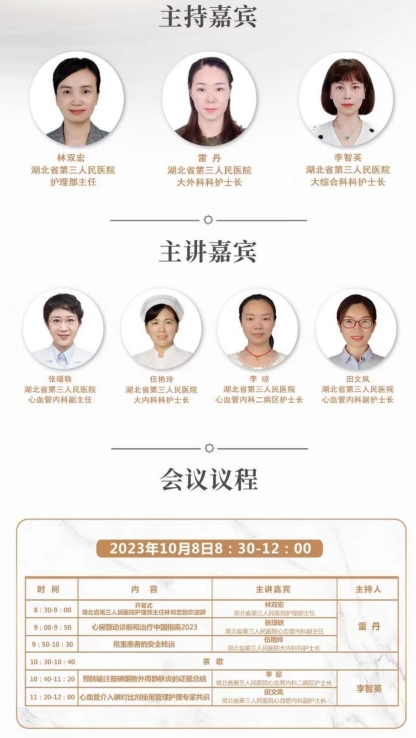 为提升心血管疾病护理安全规范化管理水平,给患者提供更加专业、精细化的服务,2023年10月8日,湖北省第三人民医院(湖北省中山医院)心血管内科在医院诚信楼学术报告厅举办了省级继续医学教育项目《心血管疾病护理安全规范化管理培训班》来自全省各级医疗机构共200余名护理人员参会学习。护理部主任林双宏到会致辞,心血管内科护士长李琼主持会议。