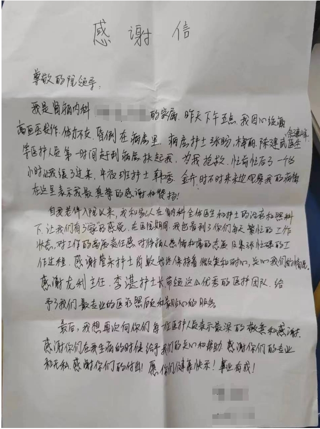 治疗期间,医护们对婆婆都非常关心,因此婆婆在感谢信中将他们的名字一一写下,“龙利主任,陈建武、余建峰医生,护士长李湛,护士梅莉、韩秀、金卉、张盼……”婆婆表示这次老伴住院和自己晕倒都多亏了科室医护的关心和照顾,让自己有了“家”的感觉,看到医护们总是忙忙碌碌,也切实感受到了医护人员的不易和辛苦。