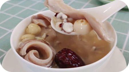 做法:将猪肚收拾干净,冷水入锅,放入姜片、葱结、料酒,大火煮几分钟,再将猪肚捞出冲洗干净。然后将猪肚切成细条,放进炖锅中。芡实、茯苓、红枣清洗干净,放进炖锅中。倒入足量清水,大火煮开,转小火炖煮一个半小时,猪肚变软糯后加盐、胡椒粉调味,再煮5分钟关火出锅。