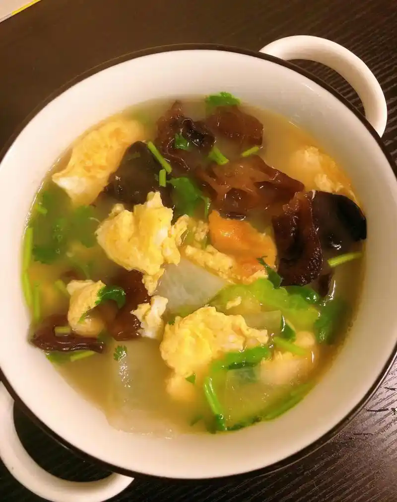 【做法】将冬瓜去皮洗净切成片;木耳洗净备用;菠菜洗净切段;鸡蛋打匀摊成蛋皮后切成宽片备用。锅内加鲜汤上火烧开,下入木耳煮沸5分钟,再将冬瓜放入,开锅后撒入食盐、水淀粉、味精,起锅前倒入蛋皮、菠菜段,淋上麻油即成。