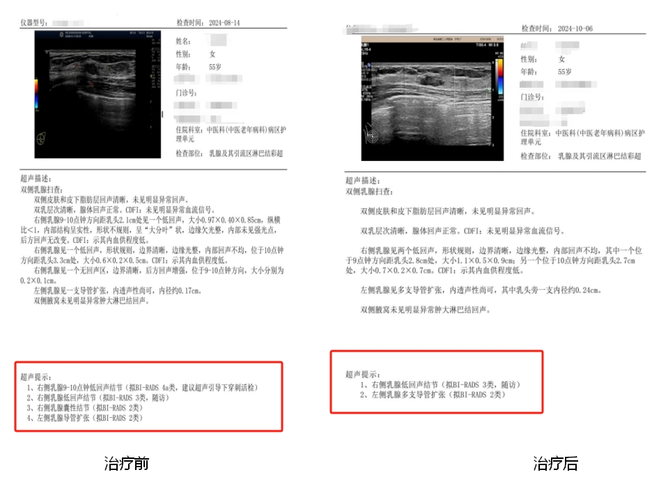 经过两个月中药内服治疗,刘女士疲劳乏力、口干口苦、心烦、失眠、多梦以及乳房胀痛症状较前明显改善,复查乳腺彩超也提示部分乳腺结节已经消散。刘女士对此感到非常高兴:“以前总担心结节会恶化,现在终于不用再提心吊胆了,心情都放松不少了,后面我要积极配合医生,把我的身体都调理好。”