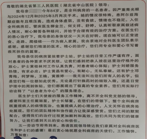 近日,湖北省第三人民医院(湖北省中山医院)全科医学科收到了一封来自阿尔茨海默病患者肖奶奶家属的感谢信。信中饱含着家属对科室医护人员的感激之情,也让全体医务人员倍感欣慰。