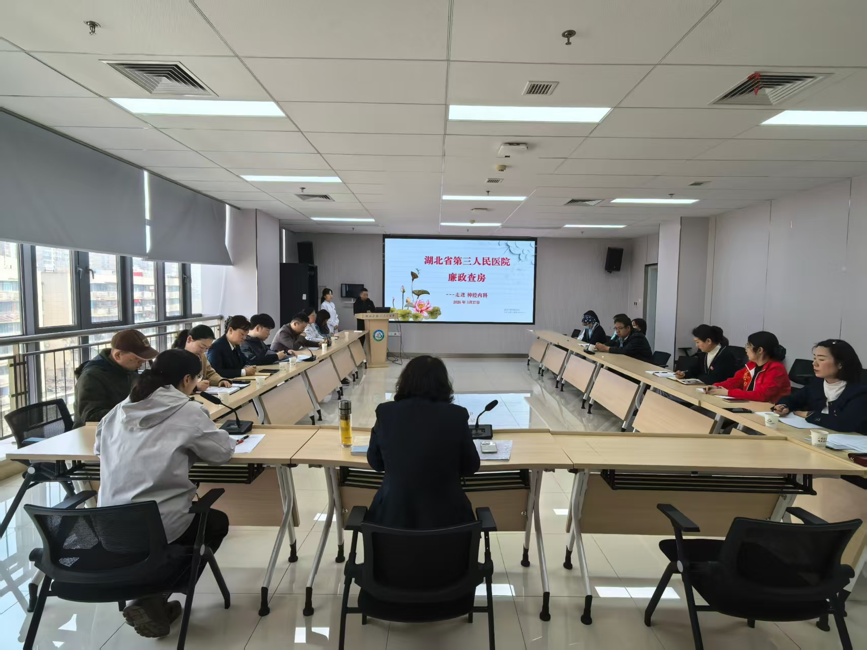 为深入推进全面从严治党向基层延伸,将党风廉政建设与医疗业务工作深度融合,切实筑牢清廉医院建设根基,3月27日,湖北省第三人民医院纪委书记陈明带队,党委办公室、组织部(人力资源部)、纪委办公室(监察审计部)、医务部、护理部、医疗保险管理办公室、医学装备部、药学部等多部门联动参与,深入医院神经内科开展2026年度首站廉政查房工作,持续深化“多方协同、上下联动”的监督格局,实现监督关口前移,让廉政监督直插临床一线。